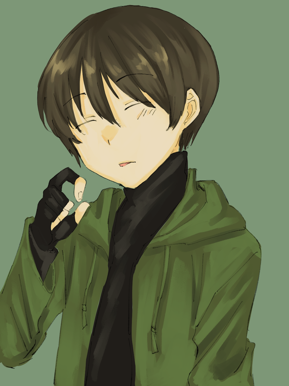 色:茶に近い黒髪、左目が緑・右目が藍色