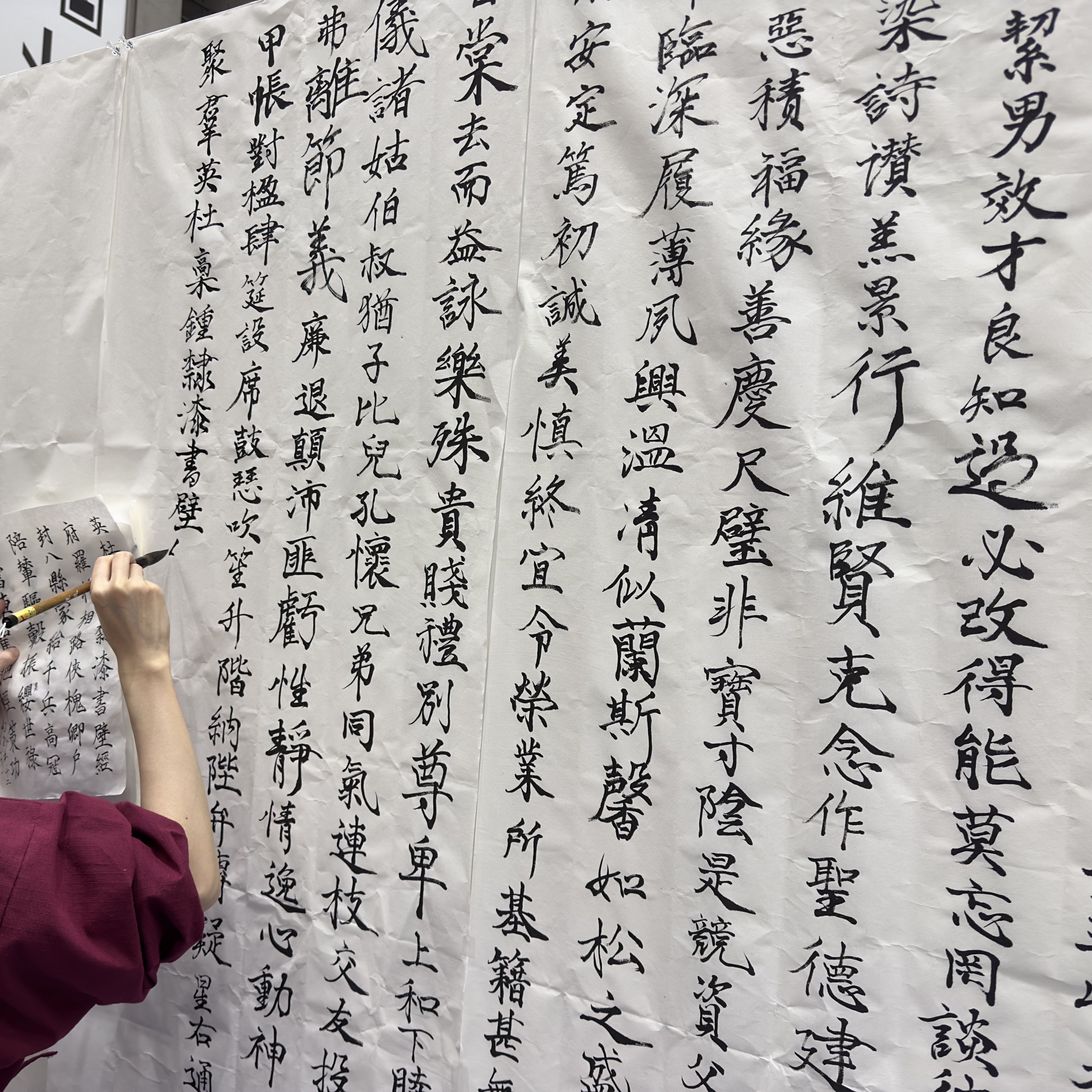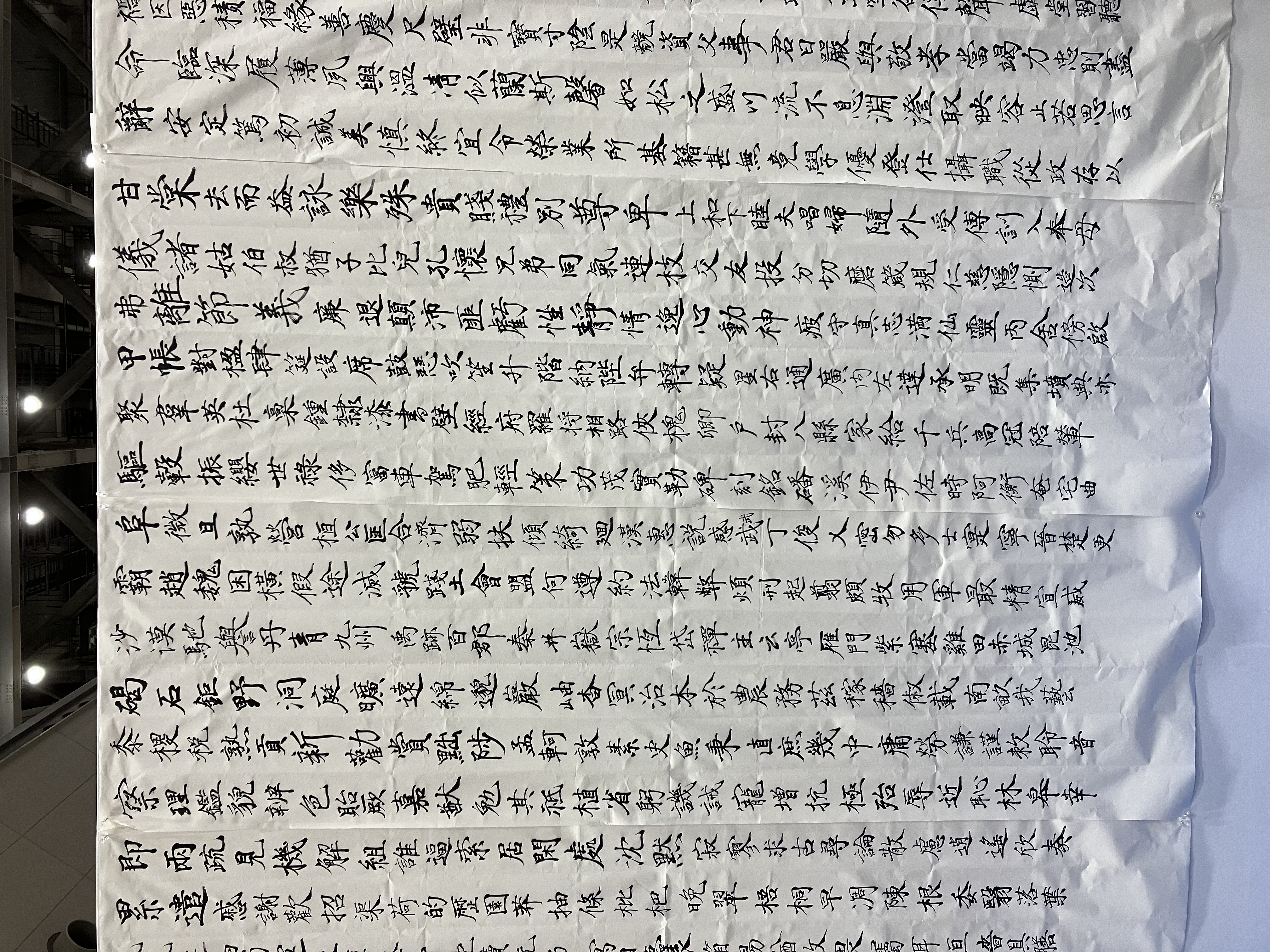 デザフェスの壁作品ですが、塗料や墨だと乾かず垂れるだろうなと思ったので、二八と呼ばれる大きなサイズの紙を7枚くらい貼って書いていました。にじみの少ない紙質のものを選んだので、墨をつけ過ぎない限りは垂れません。